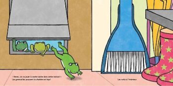 Tomoko Ohmura aime jouer avec les nombres, et c’est au jeune lecteur de trouver où sont cachées les grenouilles ( 3,7,10,18, etc …); pas toujours facile car l’artiste joue d’inventivité ! mais si il ne trouve pas, la solution arrive dans la double page suivante, lorsque les grenouilles surgissent de leurs cachettes, avant de réinventer leur jeu dans une autre pièce de la maison dans la double page suivante !