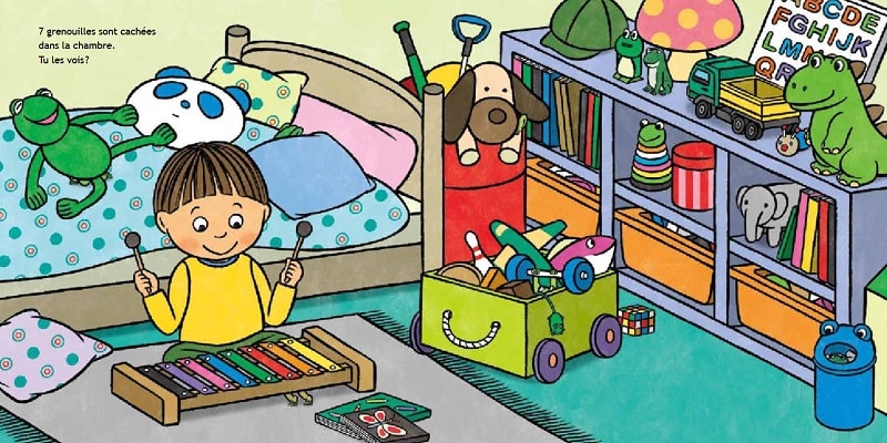 Tomoko Ohmura aime jouer avec les nombres, et c’est au jeune lecteur de trouver où sont cachées les grenouilles ( 3,7,10,18, etc …); pas toujours facile car l’artiste joue d’inventivité ! mais si il ne trouve pas, la solution arrive dans la double page suivante, lorsque les grenouilles surgissent de leurs cachettes, avant de réinventer leur jeu dans une autre pièce de la maison dans la double page suivante !