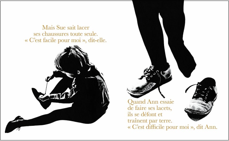 Ce magnifique album photo-illustré paru en 1960 aux États-Unis sous le titre « Is It Hard ? Is It Easy ? » célèbre ce qui rend chaque enfant unique et invite à prendre confiance en soi à tout âge. « Le livre avance en effet une idée centrale : la difficulté est subjective. /…/ et introduit les notions d’apprentissage individuel. » (Laurence Le Guen). Le traitement photographique de Len Gittleman, « jouant avec les procédés chimiques du développement pour obtenir de forts contrastes tout en conservant les expressions des enfants, simplifie et concentre la lecture sur l’essentiel de l’action » (Laurence Le Guen) ; l’ensemble – joint à une mise en scène épurée – créant un effet proche du travail de silhouette ou d’ombres chinoises .