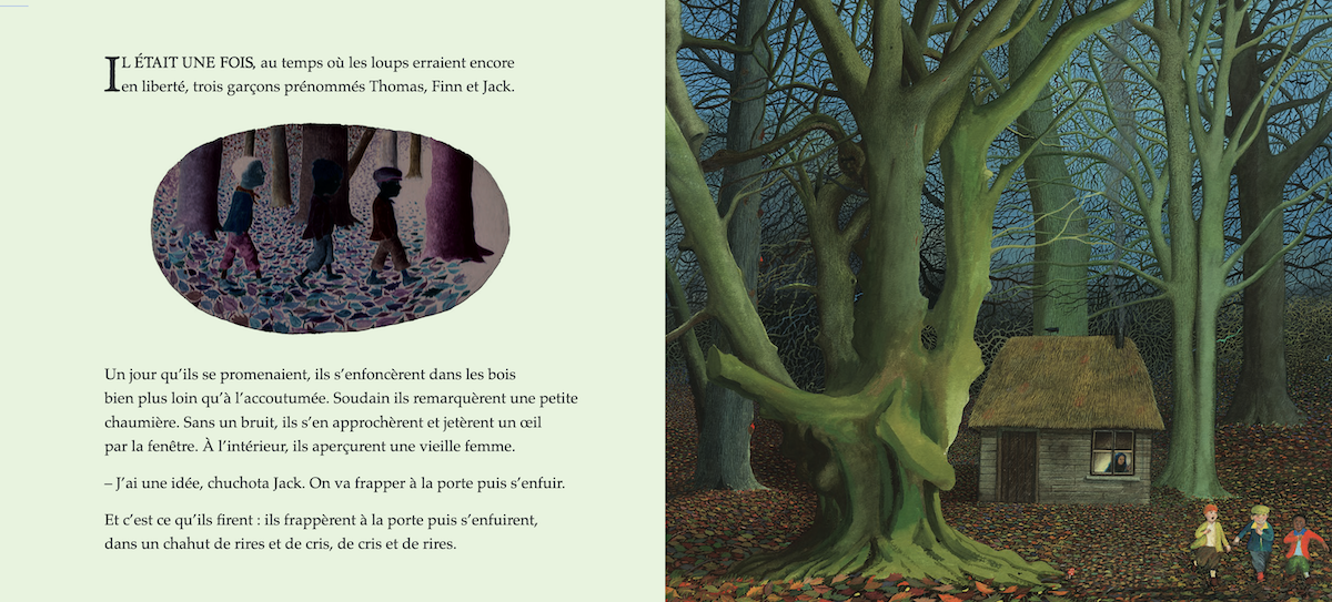 « Il était une fois, au temps où les loups erraient encore en liberté, trois garçons prénommés Thomas, Finn et Jack. » Un jour qu’ils se promènent dans les bois, les enfants découvrent une petite chaumière où vit… une sorcière ! Du moins, Jack en est persuadé. Pour effrayer la vieille femme, il imagine une farce cruelle. Et tandis qu’il s’enfonce dans sa propre méchanceté, l’isolement le guette… Face au danger, sur qui pourra-t-il compter ? ( source : l’école des loisirs)