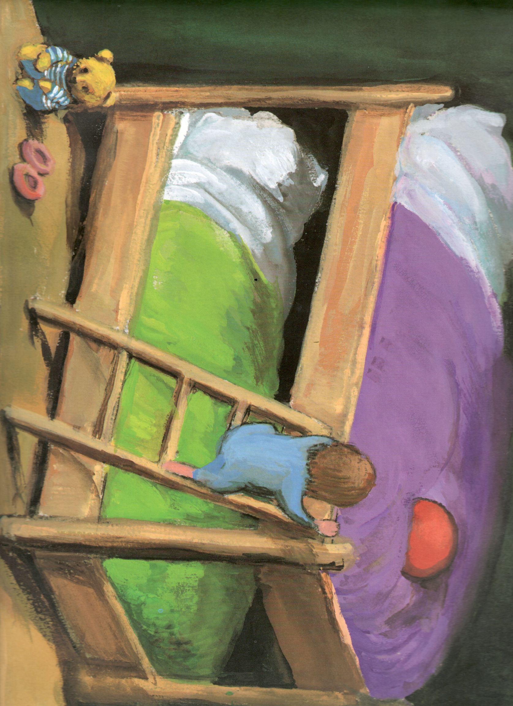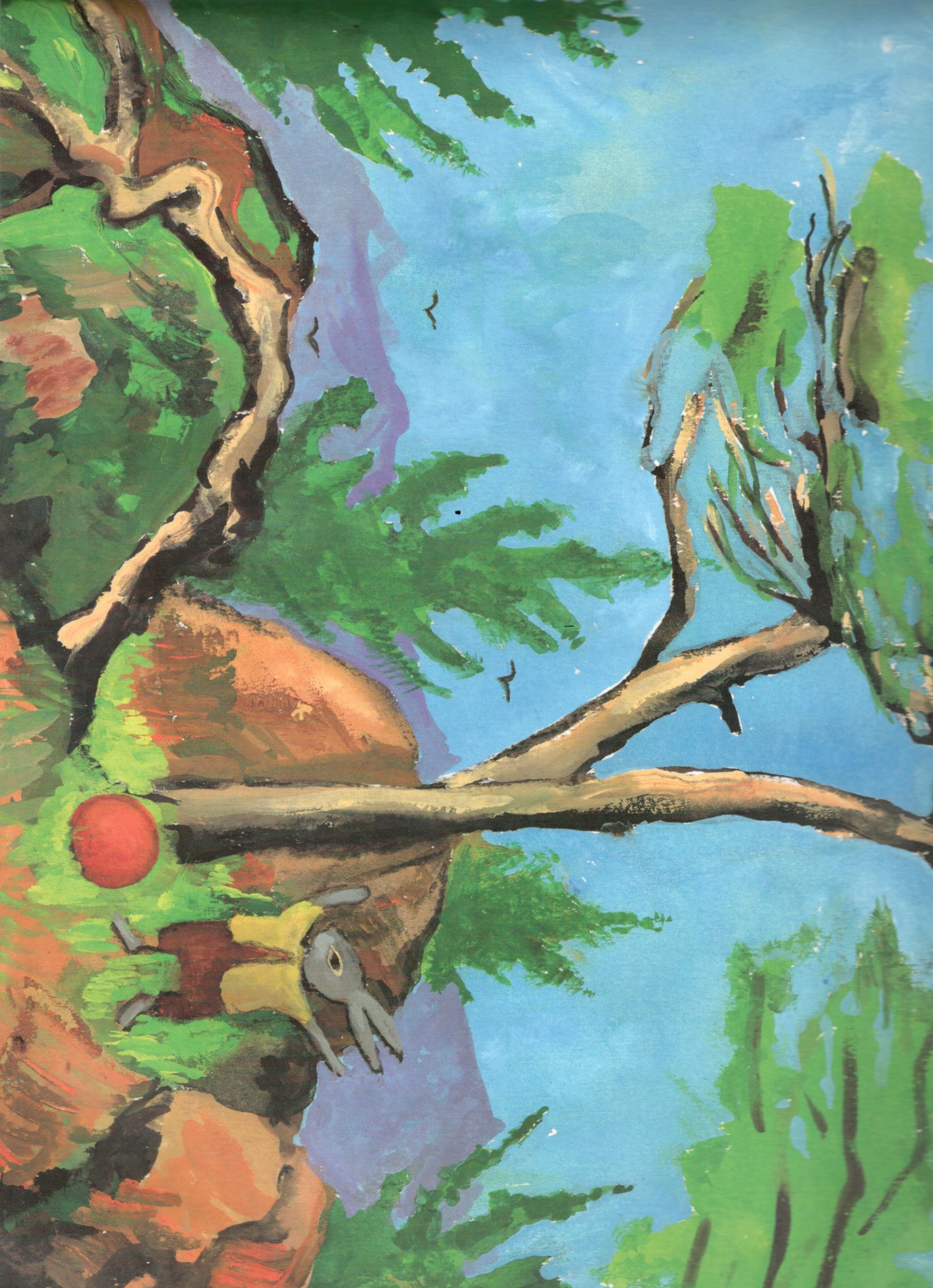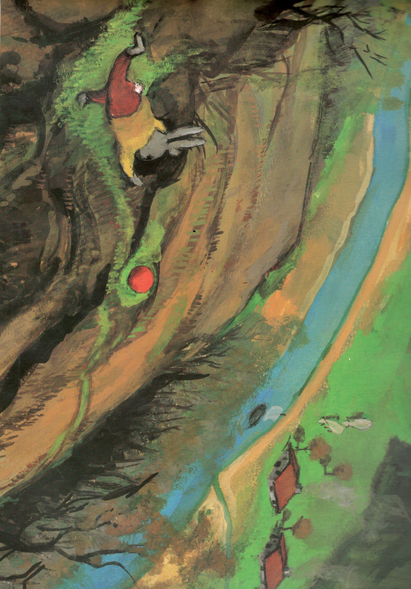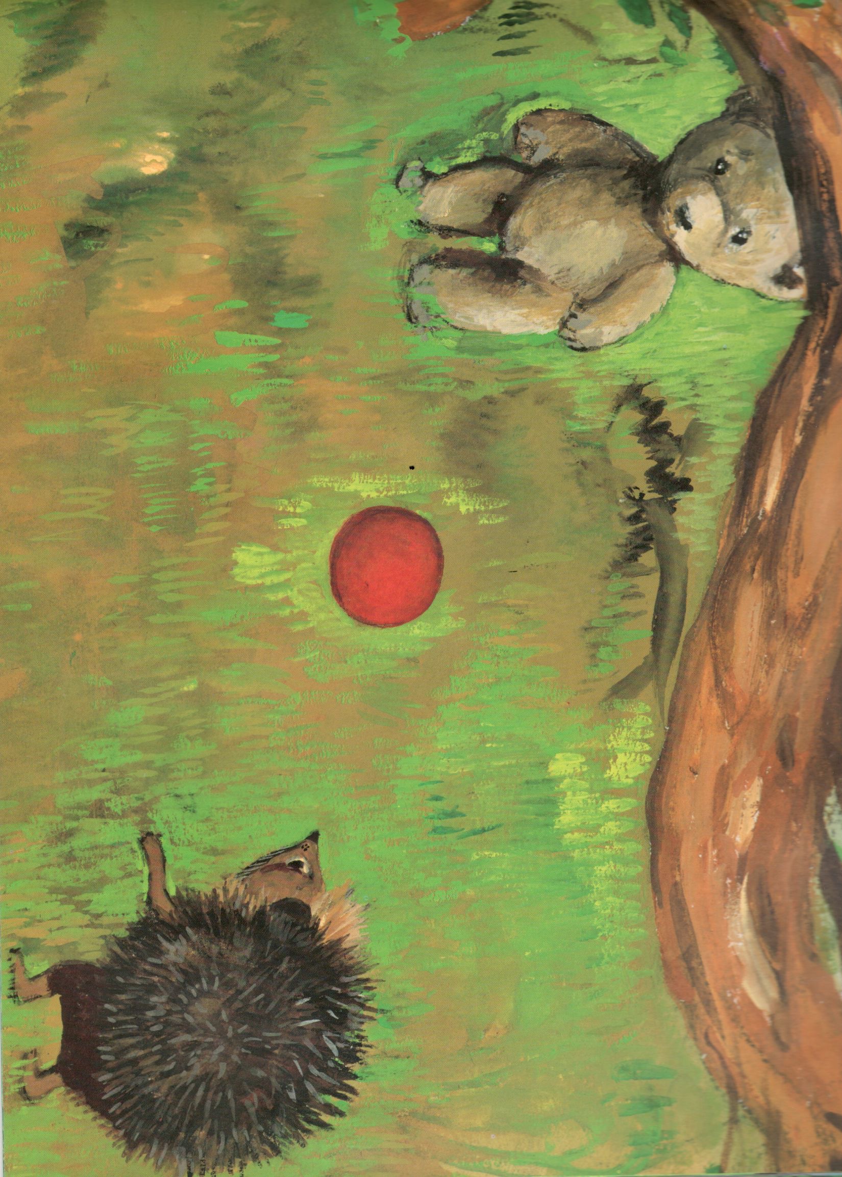 Une histoire randonnée qui court court, roule roule … on suit en plongée le ballon avec délice jusque dans la vallée – les images dynamiques à la gouache d’Olga Lecaye nous entrainent dans cette folle course poursuite au cours de laquelle on traverse bois et près et l’on croise les animaux de la forêt.