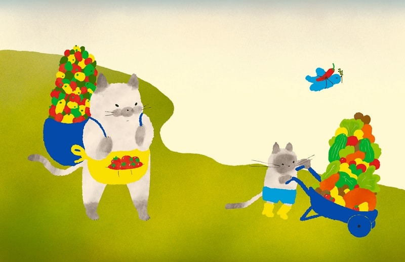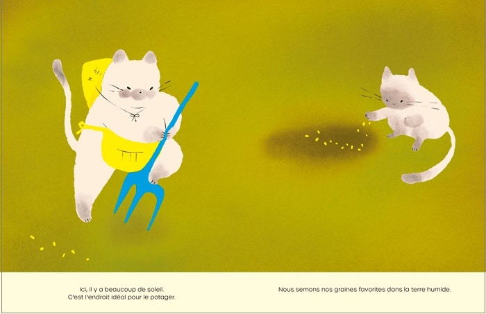 Un album plein de charme, avec ses héros chats, qui ne peut que donner envie de jardiner – car certes, on sème, on arrose, on prend soin des semis, on est attentif à la nature autour de soi ; mais on se pose pour lire, partager un moment de musique ; et une fois la récolte faite, on partage de bons plats avec les amis.