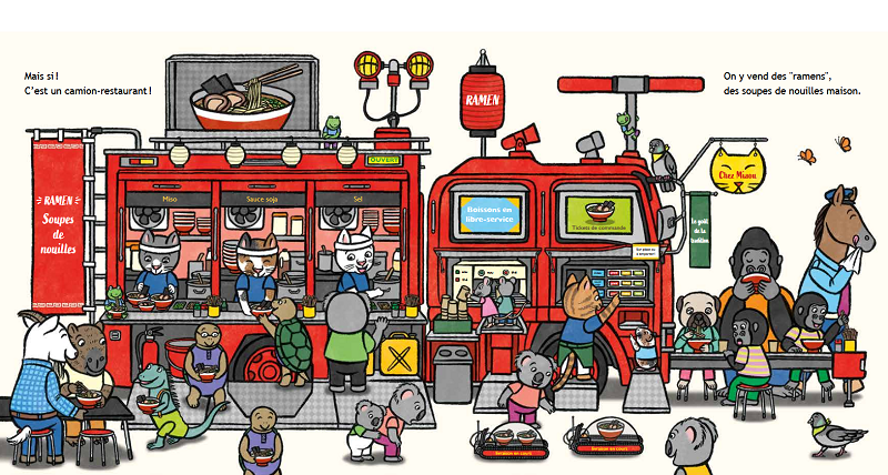 Arrivent successivement une camionnette, une voiture de police, un camion de pompiers, un camion malaxeur, un camion-poubelle, une voiture de sport et une file de bus… pas comme les autres ! Ce sont tous des food-trucks. Chacun propose sa spécialité : hamburgers, ramen, glaces, pizzas… Le plus difficile maintenant qu’ils sont là, c’est de choisir !