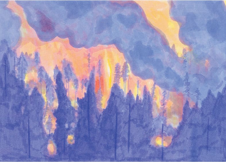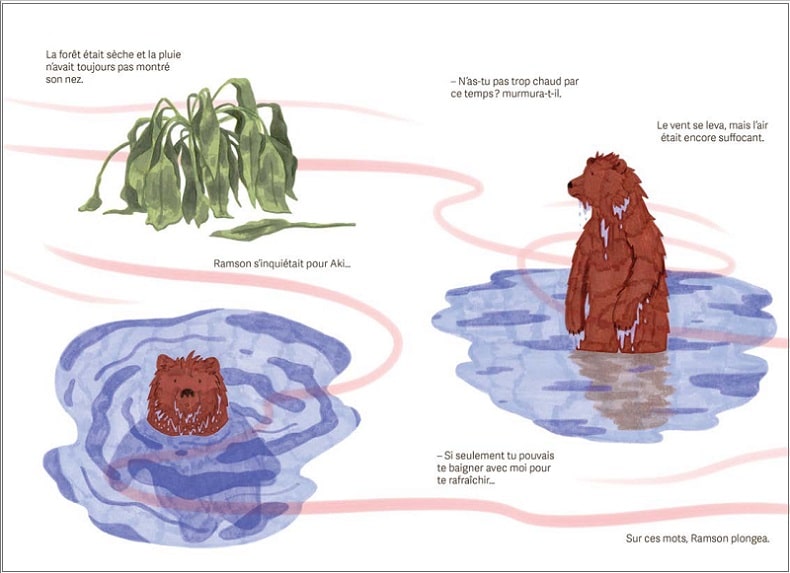 C’est le début du printemps dans la forêt d’Aki, l’air embaume l’ail sauvage ; le sol est recouvert d’un tapis de pâquerettes, narcisses et primevères. Les animaux s’éveillent ; seul Ramson l’ours dort encore, mais plus pour longtemps. L’été et la sécheresse vont succéder au printemps ; Ramson se baigne. Mais que va devenir la forêt, qui un jour prend feu par cette trop grande chaleur ? « Ramson entendit un dernier murmure d’Aki : Reste dans l’eau ! Tout ira bien ! » …