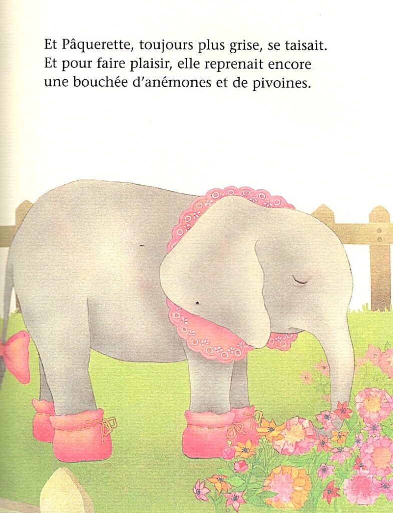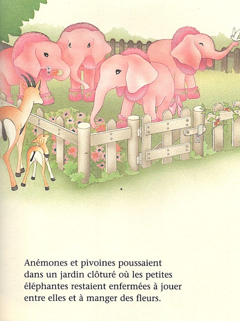 Ça commence comme un conte de fée …mais ça se poursuit comme un conte à l’envers où une jolie petite éléphante refuse les codes qui obligent les petites éléphantes à devenir roses en mangeant des anémones et des pivoines pour avoir la peau lisse et rose et à rester enfermées sagement dans un enclos alors que les petits éléphants restent gris et s’amusent comme des petits fous librement.