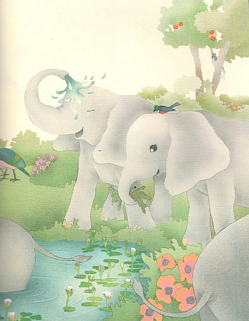 Les illustrations de Nella Bosnia à dominante rose, la couleur de la féminité par excellence, sont belles et douces, mais non sans humour, les éléphantes à petites collerettes et chaussons y sont délicieusement ridicules accentuant ainsi le propos d’Adela Turin. Un propos très actuel de cet album qui a pourtant 31 ans !