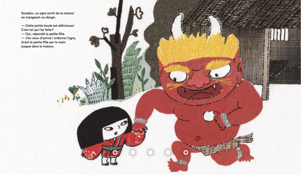 Le travail de broderie et de couture de Micao , rare dans l’album pour enfant, apporte à ce livre un charme étonnant, et une étrangeté qui convient à l’univers du conte japonais peuplé de Yokai, terribles monstres dévoreurs d’enfants. Une version japonaise qui fait penser à Hansel et Gretel et au Petit chaperon rouge .