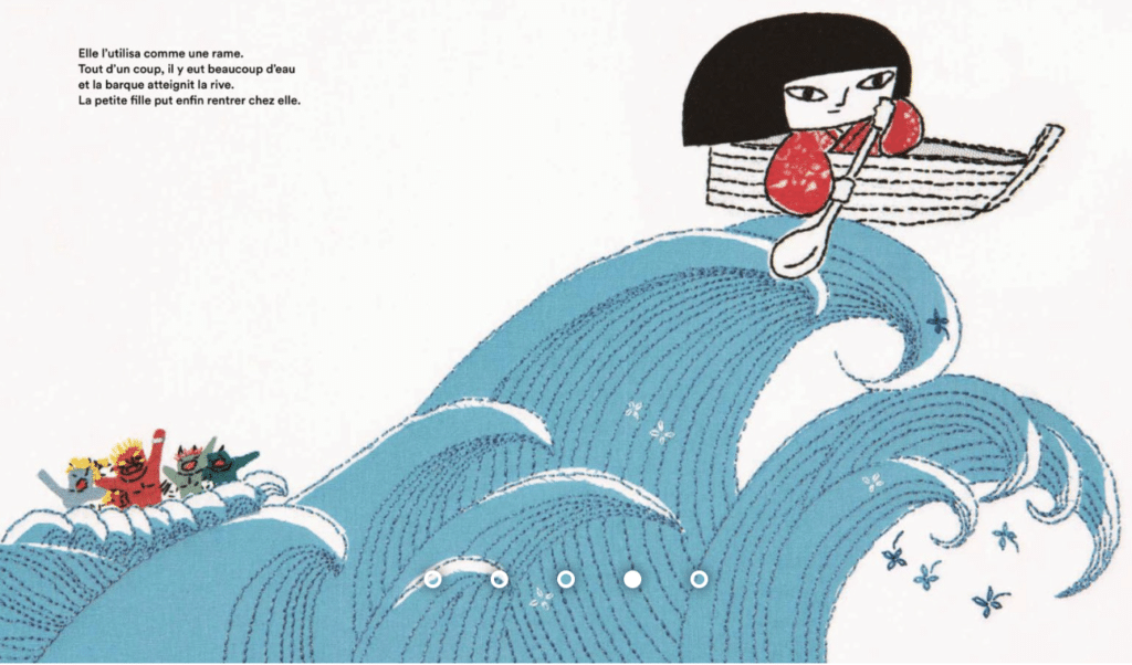 Les gros plans spectaculaires et dynamiques nous permettent d’admirer le travail de broderie de Micao. Un personnage féminin intrépide, un monde dangereux peuplé d’ogres gourmands, une louche magique , une fin qui se termine par la jolie formule traditionnelle « et voila c’est la fin » dans les contes japonais et nous plongeons dans cette aventure haletante!