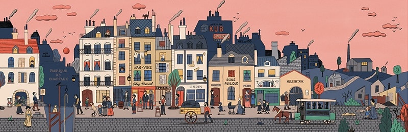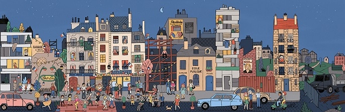 L’album, initialement paru en 2019 est une nouvelle édition avec changement de couverture et ajout d’une double-page pour 2026. Le texte vient sur un rabat vertical à droite de l’image, qui une fois déplié, permet de découvrir la rue dans son intégralité. La grande richesse de cet album tient au fait qu’il raconte une part d’histoire de France sous l’angle sociétal – immigration mais aussi exode rural – et son évolution au cours du XX e siècle ; l’ensemble est raconté avec des personnages à retrouver dans l’image, et dont la vie est à suivre au fil du temps. Conjointement, l’évolution du paysage urbain de cette rue est très intéressante à découvrir, par le bâti mais également par les affiches publicitaires ou culturelles sur les murs, avec un remarquable travail de documentation à la base. Les enfants pourront passer des heures à regarder, retrouver, suivre, dans cet album au message fort. Quant au graphisme (technique numérique), il s’associe parfaitement au projet. Un livre documentaire à avoir dans sa bibliothèque !