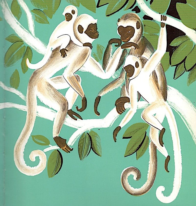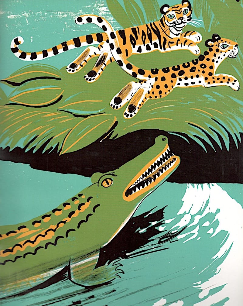 Dahlov Ipcar aime les animaux, et ceux de la jungle particulièrement, les couleurs rayonnantes explosent , la végétation stylisée envahit les pages, la diversité des animaux de la jungle se découvre à travers les rencontres que font des deux compères. En les suivant, les lecteurs se baladent dans une jungle accueillante et pleine de surprises … parfois dangereuses, le crocodile aux dents acérées qui de déploie sur une double page nous fait agréablement frissonner .