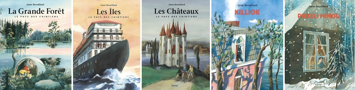 Avec les trois tomes du « Pays des Chintiens » que sont La Grande Forêt, les Iles, les Châteaux (éditions Pastel), Anne Brouillard a créé un univers « total », à son image, dans lequel paysages et personnages vivent en symbiose. Forêts du nord, hautes futaies, chemins de halage, vastes demeures retirées ou cabanes, chaleur de l’âtre, aube ou crépuscule, ombres, neige, train au loin, lac ou rivière … Le talent d’Anne Brouillard est là, dans ses extraordinaires peinture des lieux, habités par Killiok et ses amis … que l’exposition propose de vous faire découvrir ou retrouver.