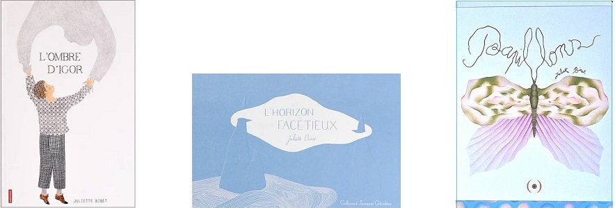 Depuis son premier album « Edmond » ( Autrement, 2007 ) Juliette Binet a construit une œuvre en une vingtaine d’albums, tous marqués par l’exigence ; le plus souvent, un récit en images, qui se déploie, qui se déplie, de page en page, par évolution ou métamorphoses successives pour « raconter ». Images virtuoses au crayon, multiples traits, subtilité des variations en noir et blanc, des ombres, rehauts de couleur, formes arrondies ou volutes … jusqu’à l’évolution vers la couleur, « que » la couleur, au pastel avec « Papillons » (éditions des Grandes Personnes, 2025)